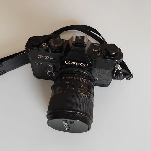 Vähän käytetty, vanha ja helppokäyttöinen Canon EOS 750 -järjestelmäkamera ja EF 35-70 mm objektiivi.
