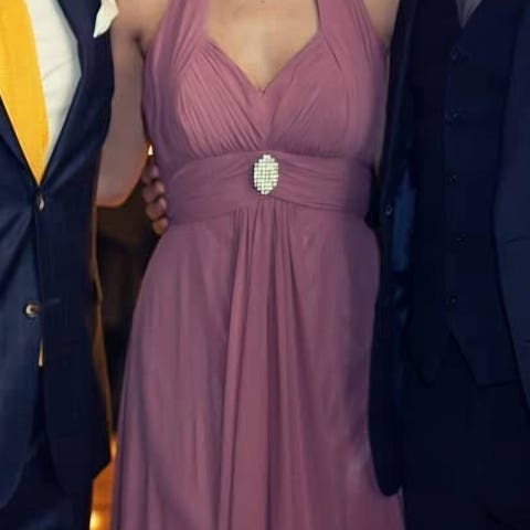 Kermanvärinen, silkkimäistä materiaalia oleva olkaimeton iltapuku esim. vuosijuhliin tai vanhojen tansseihin. Sopii noin 165cm pitkälle korkojen kanssa tai hieman pidemmälle matalilla kengillä. Ostettu aikoinaan USA:sta, ja paikallista mitoitusta koko 2, mutta pukua on kavennettu ompelijalla. Euroopan mitoituksella koko on suunnilleen XS. Käytetty vain kahdesti, helmoissa pientä tahraa siinä missä helma osuu lattiaan, mutta ei näy kun puku on päällä.