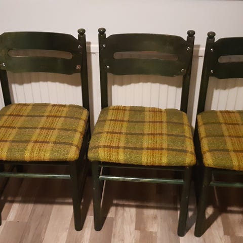 Vanhat koivuvanerista tehdyt tuolit, joissa pehmustetut siniset istuinsuoja ja selkänoja. Päälliset siistit. Jalat hopeanväristä metallia. Korkeus n 80 cm, istuinkorkeus 45 cm, syvyys 53 cm, leveys käsinojien kohdalta 63 cm ja selkänojan kohdalta 46 cm. Vanerissa on molemmissa tuoleissa pieni rikko alareunassa, ei näy päälle. Metallijaloissa taipuisat tassut. Vain nouto.