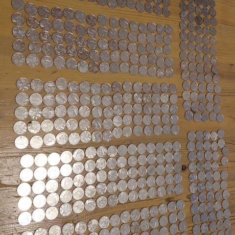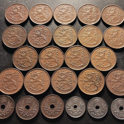 Myydään 53 kpl 10 pennin kolikoita vuosilta 1990 - 2000: