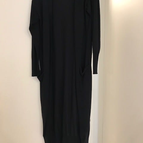 House merkkinen musta / valkoinen neuletakki. Naisten M koko. Löysä ja pitkä neuleen malli. Hyväkuntoinen rento neule. Takissa on vähän vajaamittaiset hihat.