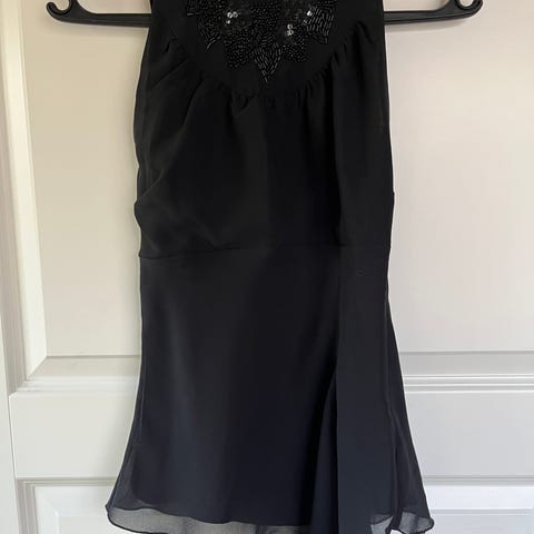 Yhden koon tummansuklaanvärinen toppi, jossa ohuet säädettävät olkaimet. Edustassa kirjailtuja kukkia, joiden keskustassa kultatähtiä, väleissä kullanvärisiä paljetteja. Edustassa on vuori. Hiukan vyötäröltä alaspäin kaarottuva.Topin materiaali on hyvin joustavaa, joten sopii monenkokoiselle.