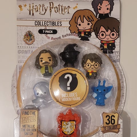 Harry Potter -tuotteet Wizarding Trunk :n kuukausipaketista. Kaikki tuotteet harvinaisempia keräilykappaleita, eivät olleet itselle mieluisia.