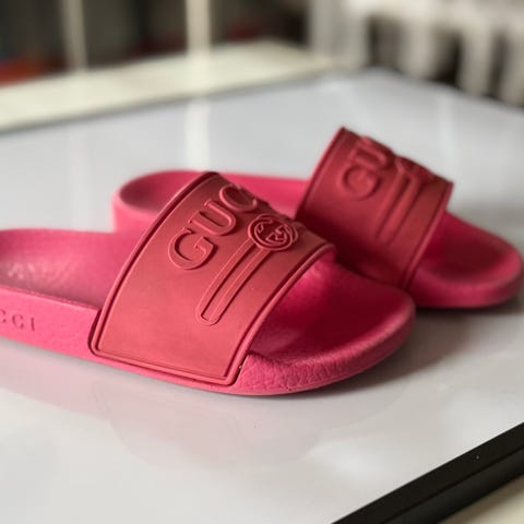 Käytetyt Guccin fucsianpunaiset tarranauhalliset lenkkarit. Kengän kärjissä ja kantapäissä pientä kulumaa. Koko 28.