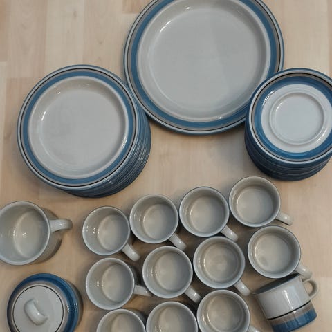 Vähänkäytetty Arabian Usva-sarja kahviastiasto. 18 kuppia (yhdessä pieni särö, ks. viimeinen kuva), 18 aluslautasta ja 12 pullalautasta.