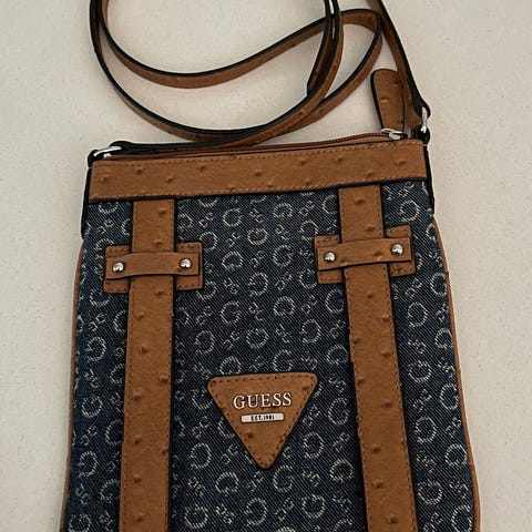 Siisti ja erittäin hyväkuntoinen Guess olkalaukku. Materiaali luonnonväri/harmahtavanruskea tukevahko puuvilla, olkahihnan ja kanttausten materiaalia en tiedä, näyttää nahkalta, en tunnista varmasti. Guess-logokuosinen vuorikangas. Sisällä vetoketjutasku, laukku suljetaan vetoketjulla. Koko 22x19 cm. Olkahihnan pituus 114 cm, pidentämismahdollisuus. Mukana suojapussi/dustbag.