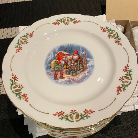 "Perinnejoulu - Jatkaa joulun perinteitä. Kata ihana joulutunnelma rakastetulla Perinnejoulu-astiastolla. Siitä tulee arvostettu sukukalleus, joka tuo paljon iloa monena, monena jouluna. Kuviot on luonut pidetty tonttujen kuvaaja Lars Carlson, joka tunnetaan erityisesti perinteisistä postikorteistaan. Ihastuttavat aiheet kunnioittavat pohjoismaisia jouluperinteitä. Laadukasta maasälpäposliinia, reunassa aito kultaus, käsin litografoitu, taiteilija: Lars Carlson." https://www.fyrklovern.com/fi/outlet/kattaus-tarjoilu/tarjoiluosat/3-kerr-vati-perinnejoulu