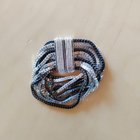 Punosmainen metallinen rannekoru. Toisella puolella vihreitä koristeita. Postitan