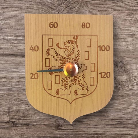 Mäntän paperitehdas -teemainen saunamittari, uusi. Materiaali kotimaista lämpökäsiteltyä koivua.