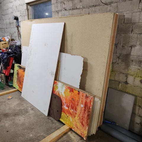 Ovia, villaa, styroxilevyjä, (kaakelia/laattoja pinetkin määrät) lautaa/puutavaraa, sementtiä, levyä, sisä/ulkomaalia, harkkoja, vesieristettä, suihkutarviketta, viemäri, putket, laattialämmitys, yms yms
