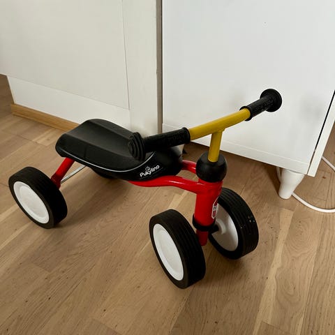 Pukyn L-kokoinen potkupyörä käsijarrulla ja jalalla. Kaksi pientä ihmistä on potkupyörällä ajelleet, joten pieniä käytön jälkiä on, mutta hyvässä kunnossa seuraavaa kuljettajaa varten.