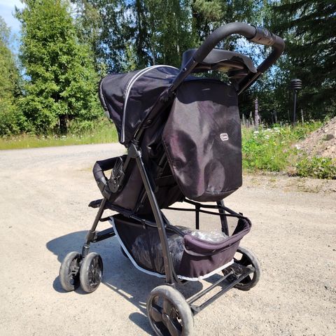 Vain pyörät (vanteet+kumit) jäljellä rattaista. Etupyörät kääntyvää mallia, sai lukittua myös suoraan. Lähetys onnistuu tarvittaessa.
