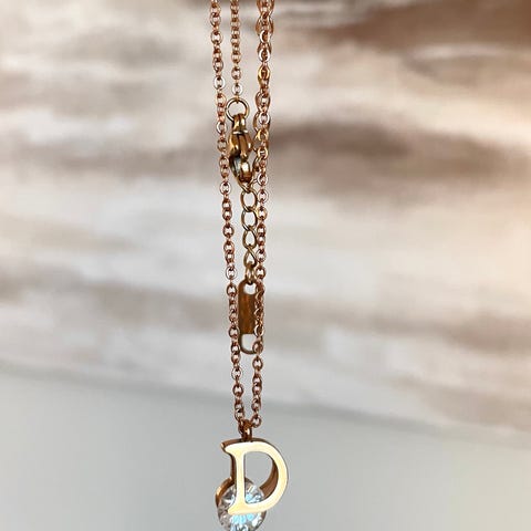 Käyttämätön V-muotoinen riipus tekotimanttikoristeilla. Pituus 72cm, mutta säädettävissä.