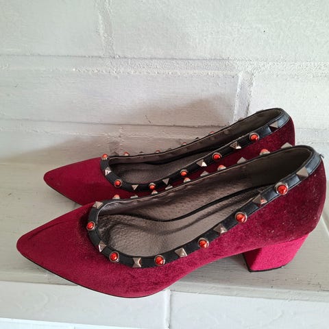 Aivan ihanat punamustat nilkkurit kiiltävällä jakardikankaalla. Takana vetoketju. Koko 36. Käyttämättömät, alkuperäisessä paketissa.