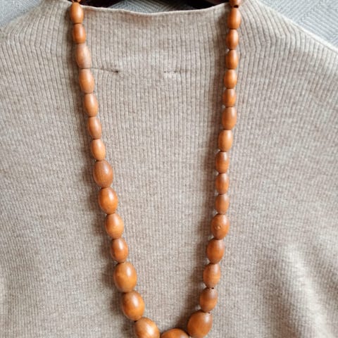 Puinen kaulakoru, jossa vaaleat pyöreät puuhelmet eri kokoisina. Helmet on pujotettu nauhaan suurimmista keskellä pienempiin kohti niskaa. Pituutta voidaan arvioida kuvassa näkyvän mittanauhan avulla. Sopii käytettäväksi asusteena arkeen tai juhlaan.