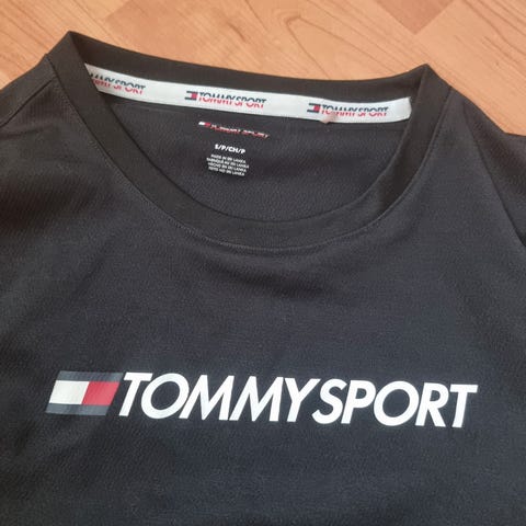 Kuvan korallinvärinen / oranssinsävyinen Tommy Hilfigerin paita, koko M.