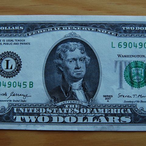 The $2 note features a portrait of Thomas Jefferson on the front of the note and a vignette depicting the signing of the Declaration of Independence