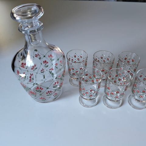 Ranskalaisen valmistajan Luminarcin 1960-luvun kuviollinen vintage liköörikarahvi. Korkeus 17,5 cm, halkaisija 9,5 cm.
