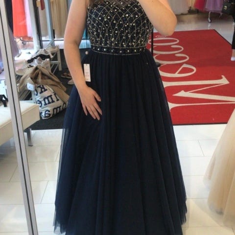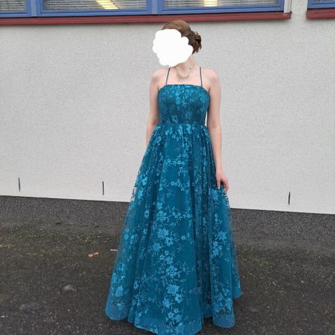 Kerran pidetty vanhojentassimekko. Mekko kokoa 38, mutta selkäosassa nyöritys jonka ansiosta voi hieman säätää kokoa. Mekon pituus kainalosta helmaan noin 129cm, mekko lyhennetty 164,5 cm pituiselle. Vyötärön mitta koristeen alta 40 cm. Rinnanympärys etupuolelta 50 cm ja ympäri noin 85 cm. Ostettu mecco liikkeestä.