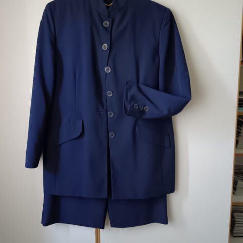Erittäin hyväkuntoinen jakkupuku, mukava päällä. Voi pestä pesukoneessa, pese ja pidä. Koko 42. Takki kai-kai 54 cm, takin pituus takaa kauluksen alareunasta noin 81,5 cm, hihan pituus olkapäästä 63 cm. Takissa vuori selän puolella puoleen väliin, takki muuten vuoriton. 82 cm, lahkeen sisäpituus haaravälistä 81 cm. Materiaali 100% polyesteri.