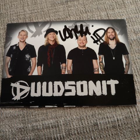 Myydään kuvassa näkyvä kehystetty Duudsonit-kortti, jossa pari nimikirjoitusta. Kissatalous.