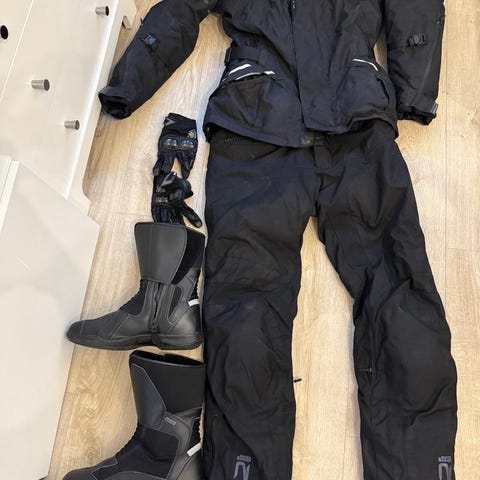 Hyväkuntoinen vähäiselle käytölle jäänyt kaksiosainen moottoripyörätakki, tikattu sisäosa kiinni vetoketjulla, koko XL.
