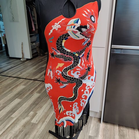 Musta valkoinen. Koko 34, kai kai n. 44, vyötärö n. 37, pituus n. 140. Kuvassa s koon nuken yllä ja n. 38 kokoisella, jolle auttamatta pieni. Kunto moitteeton, ei haise/tuoksu. Ohutta puuvillaa, mainio kesäänMmm
