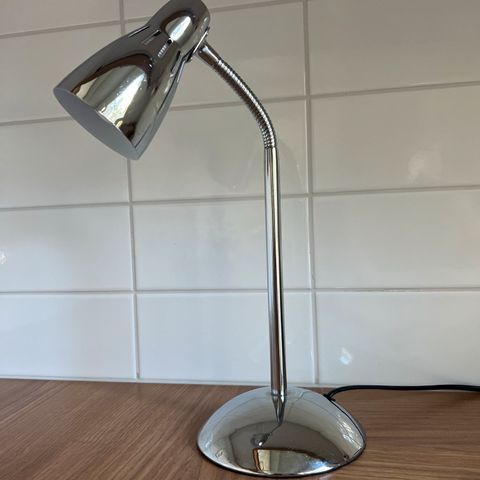 Ikean pöytävalaisin, jossa musta metallijalka ja pliseerattu luonnonvalkoinen kangasvarjostin. Korkeus 63 cm. Nouto Veräjämäestä.