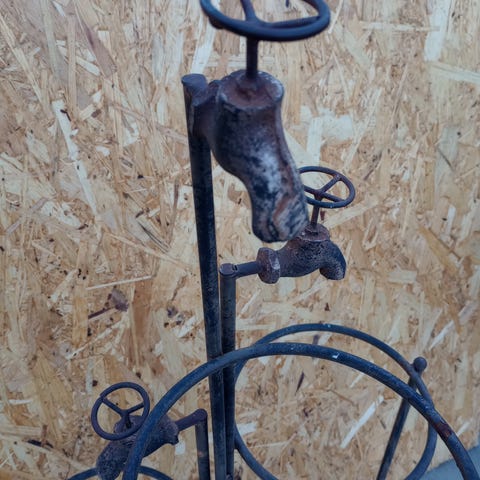 Kuvanmukainen sepän tekemä iso kukkateline.