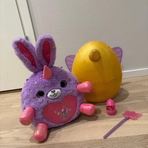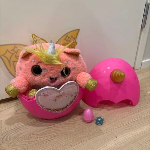 Yllätysmunan sisällä koiranpentu ja pienempi yllätysmuna, jossa myös pikku koira mukana. Uudenveroinen.