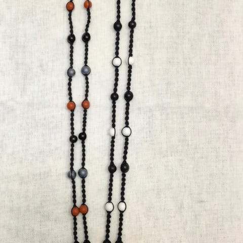 Puuhelmistä johtuen avainkaulanauha on kevyt. Niskassa on turvalukko. Pituus ilman lukkoja kaksinkerroin n. 50cm.