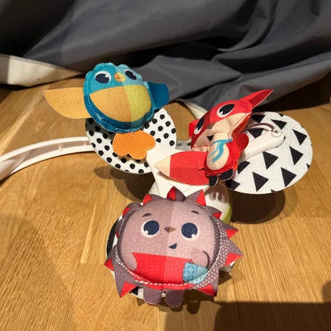 Aivan ihana mobile lapsen pinnasänkyyn nukahtamisen avuksi. Neljä kaunista sävelmää ja liikkuvat hahmot. Mobilen mukaan 0-5 kk vauvoille, meillä pidettiin huomattavasti pidempään, koska lapset (ja aikuiset) tykkäsivät niin kovin. Kestävää tekoa.