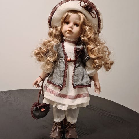 Sievä posliini nukke 34cm, ehjät vaatteet, lappu vaatteissa: Tiimari. Nukke on istumaasennossa. Huom. käsi liimattu. Hml