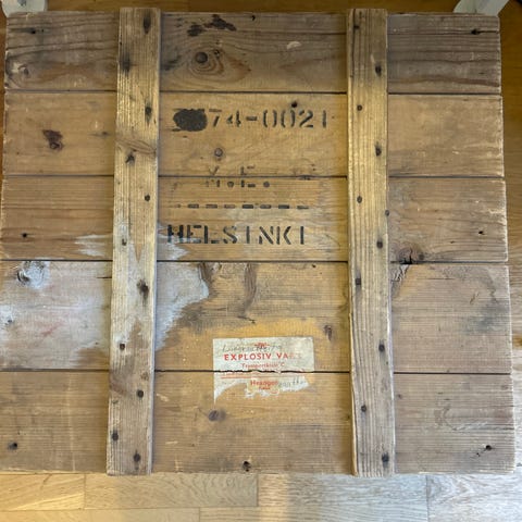 Hyväkuntoinen, vanha kuljetuslastikko. Korkeus 38 cm, leveys 48 cm ja syvyys 26,5 cm.
