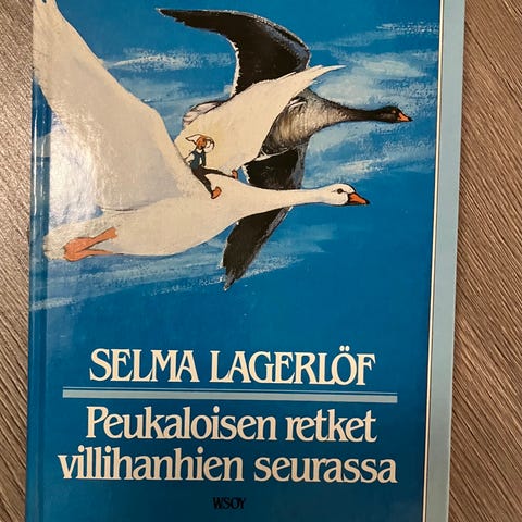 Selma Lagerlöf, Nils Holgerssonin ihmeellinen matka, WSOY, 5. painos, 2008, ISBN 978-951-0-15738-1, kuvittanut Lars Klinting ja suomentanut Päivö Taubert. Kovakantinen 95-sivuinen kirja on kauniisti kuvitettu ja herkkä kertomus pieneksi peukaloiseksi muuttuneen Nilsin matkasta ympäri Norjaa. Ei omistetta, todella hyväkuntoinen ja siisti. Toimituskulut lisätään, ei toridiiliä.