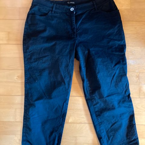 Kevyet, mustat trikookaprit. Koko 42/44. Resorivyötärö. Lahkeensuissa koristeina 6 pientä metallinappia. Lahkeen sisäsauman pituus 53 cm. Vyötärö 64 - 112 cm. 95 %, pv/ 5 % elastaani. Käyttämättömät. Postimaksu 7,90e.