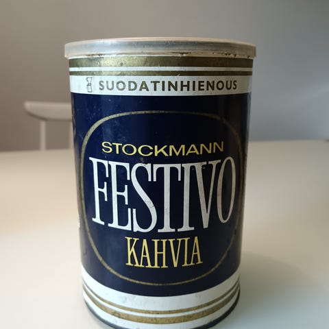 - erinomaisessa kunnossa oleva Paulig Stockmann Festivo kahvipurkki, korkeus 15,5 cm ja halkaisija 11 cm, 8e