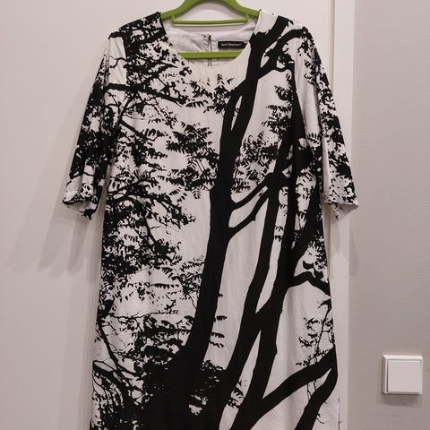 Hyväkuntoinen tyylikäs Marimekko mekko. Mekkoon kuuluu lilanvärinen vyö, joka eri kuvassa. Vyö samanvärinen lila kuin mekossa. Vetoketju selkäpuolella, takana helmassa halkio. Materiaali, luonnonkuitu 55 % modaali, 45 % puuvilla. Koko 38.