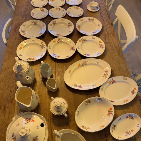Maalla -lehdessä 1/2025 oli hinta-arvio kahvikuppipari 25euroa ja tarjoiluvati 40euroa. Eli tuo kokonaissumma ei liene puoltakaan noista hinnoista.
