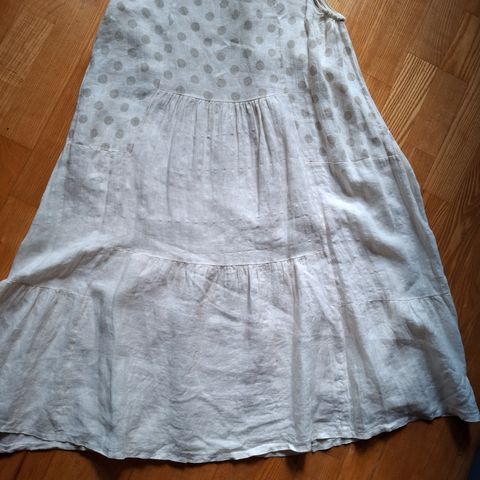 Kuvanmukainen Moefirma Levandi- merkkinen virolainen pellavamekko 1990- luvulta. Mekossa on paljon kauniita yksityiskohtia. Itse olen pitänyt pitkähihaisen puseron kanssa( kansallispuvun pusero), mutta helteellä menee ilman puseroakin. Selässä napitus. Kainalosta kainaloon 50 cm ja koko pituus 133 cm. Kunto oikeastaan uutta vastaava.