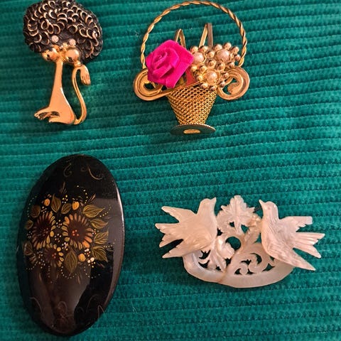 Kuva 1) Amerikan-tädin pienet glitter-rintaneulakorut 1920-30-luvuilta :