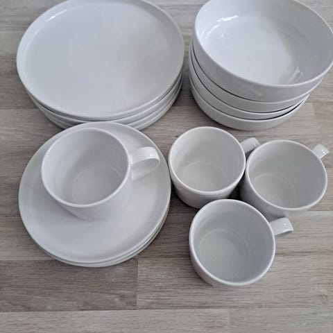 Nyt lähtee halvalla hyvässä kunnossa oleva valkoinen astiasto. Settiin kuuluu kolme isoa lautasta, 12 pientä lautasta ja 11 mukia. Lisää kuvia saa ottamalla yhteyttä!