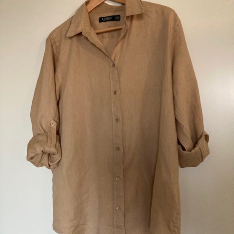 H&M. Rami on siis luonnonkuitu joka kuin pellavaa, rypistyy vain vähemmän... Ohessa tietoa siitä: (https://laatukangas.com/materiaalit/rami/?srsltid=AfmBOoqibQoCDdik7bwZ-sc2RThgCEpeP27QWTzlir40DAHRh92bvF8r) Niska-helma 68cm, kai-kai 57cm, kainalo-hihansuu 50cm. Hihat voi lyhentää tampilla. Mallinukke 36/s kokoa. Kerran pari pidetty siisti. Ei sovituksia, ei toridiiliä, en tingi. Nouto tarkka aika sovitusti etukäteen ma-pe kl.10-16 Hki 88 tai postitse pakettina.