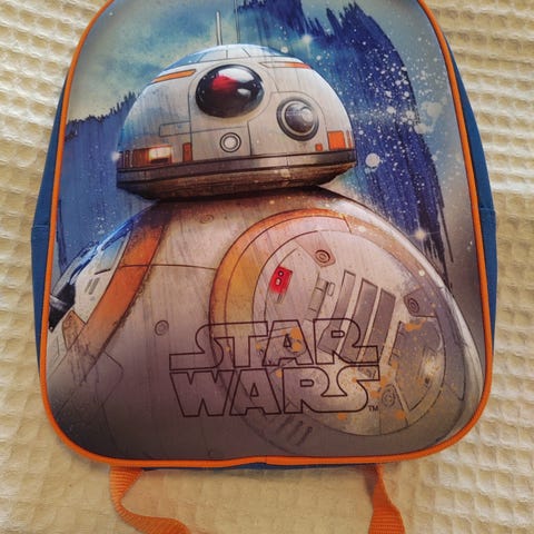 Harmaa-punainen Star Wars eskari-/kerhoreppu (viimeisessä kuvassa saa osviittaa koosta, kun vieressä on iso koulureppu). Reppu on juuri pesty, moitteet näkyvät kuvissa, mutta on edelleen käyttökelpoinen!