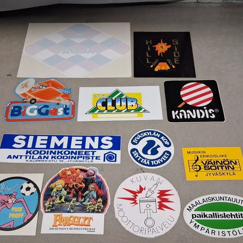 Katso kaikki kuvat. Tarrat ovat pitkälti 70-80-luvulta. Aiheena tässä ryhmässä: yritykset, tietotekniikka, hifi, henkilötfarkut. Pääasiassa hyväkuntoisia tarroja kaikki. Itsellä ei nyt ole juuri aikaa, alkaa jokaista tarraa nimeämään / hinnoittelemaan. Se mitä olen googlettanut niin tarrojen hinnat yleensä pyörivät 0,50 - 10 euron välissä ja sitten harvinaisemmat maksaa enemmän. Jos joku tarra kiinnostaa, niin tee tarjous, niin katselen sitten tarkemmin sen tarran kohdalla asiaa. Pistä kysymyksiä tulemaan esim. koosta, niin mittailen niitä sitten.