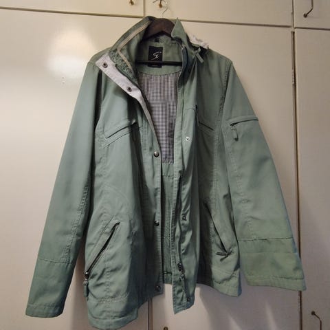 Irroitettava huppu. Kainaloissa vetoketjuin suljettavat tuuletusverkot. Sisätasku.