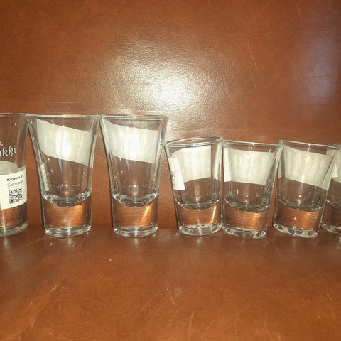 Myydään 2 kpl snapsilasia possu ja sydänkuviolliset