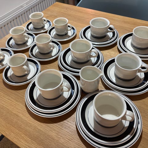 Myynnissä Arabia Faenza Mustaraita kahvikupit 6 kpl. Siistit ja ehjät. Design Peter Winqvist. Vuosi 1973-1975. Myynnissä 6 setti, hinta yhdelle settille 15,- euroa. Postikulut ostajalle 6, 90 tai nouto Ruoholahdesta.