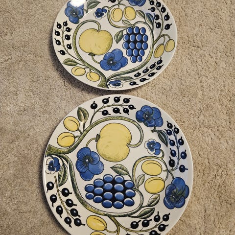 Arabia Paratiisi lautanen. Hieno ja tyylikäs. Hyvässä kunnossa. Käytettyjä ovat. Haalistumista ja kulumaa on. Ei halkeamia. Halkaisija 25.5 cm. 45 e / 2 kpl.