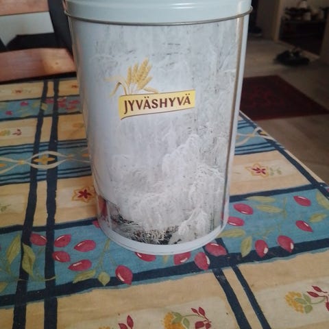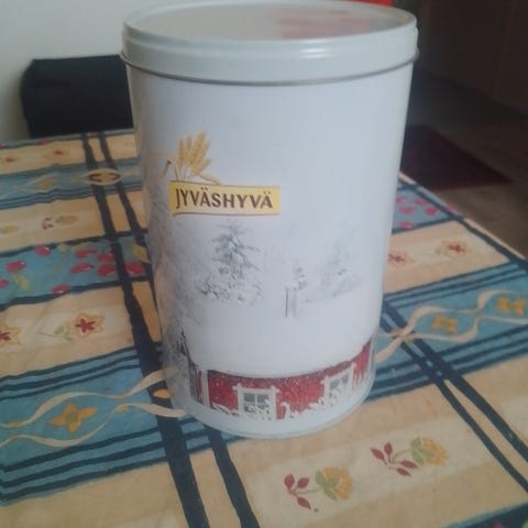 Käyttämätön Jyväshyvä peltipurkki, halkaisija n14cm ja korkeus n20cm.